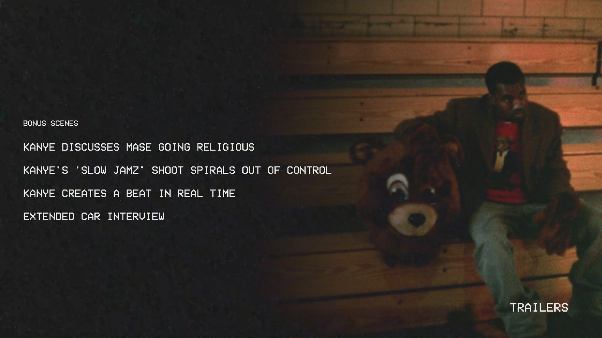 - Deleted scenes: "Kanye Discusses Mase Going Religious", "Kanye's 'Slow Jamz' Shoot Spirals Out of Control", and "Kanye Creates A Beat In Real Time"!